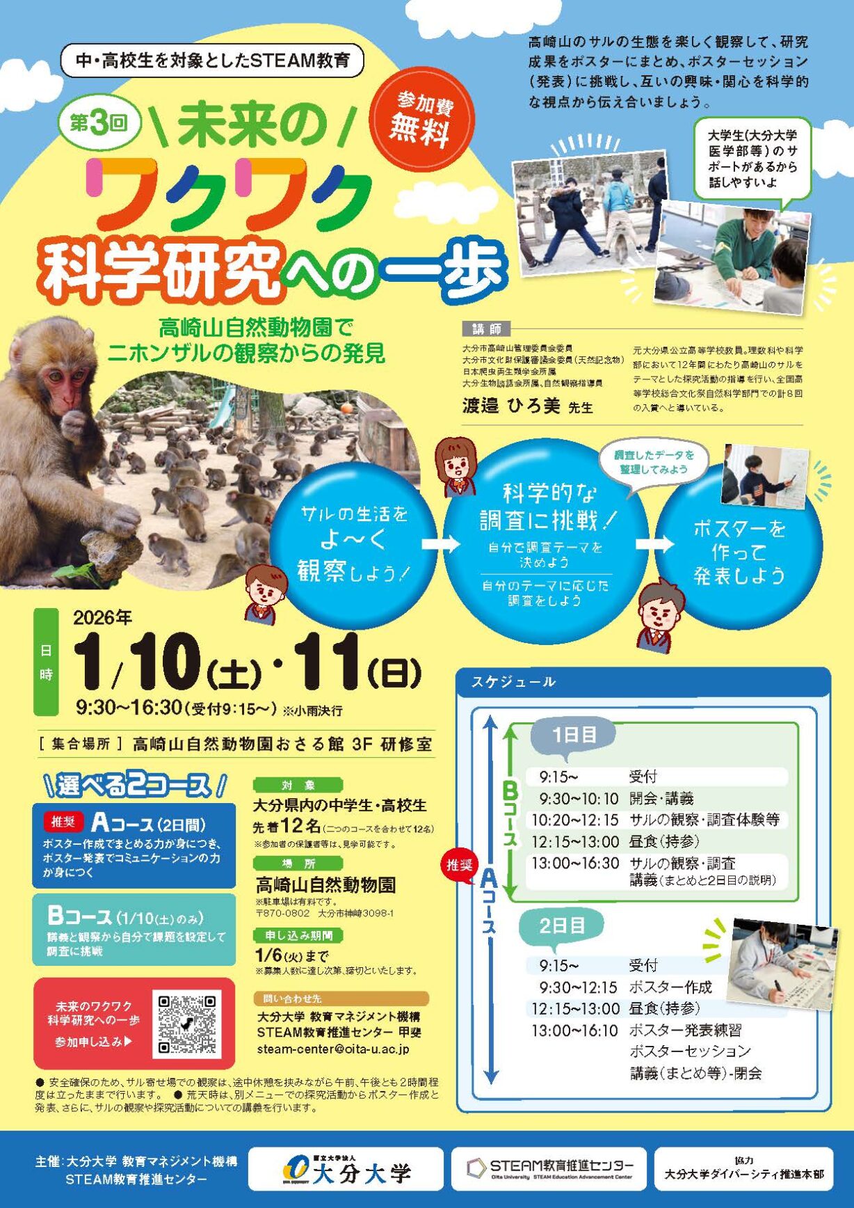 2026年1月10日(土)・11(日)に中高生を対象とした講座 「第3回 未来のワクワク科学研究への一歩〜高崎山自然動物園でニホンザルの観察からの発見〜」を開催します。