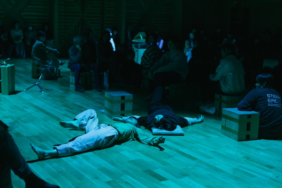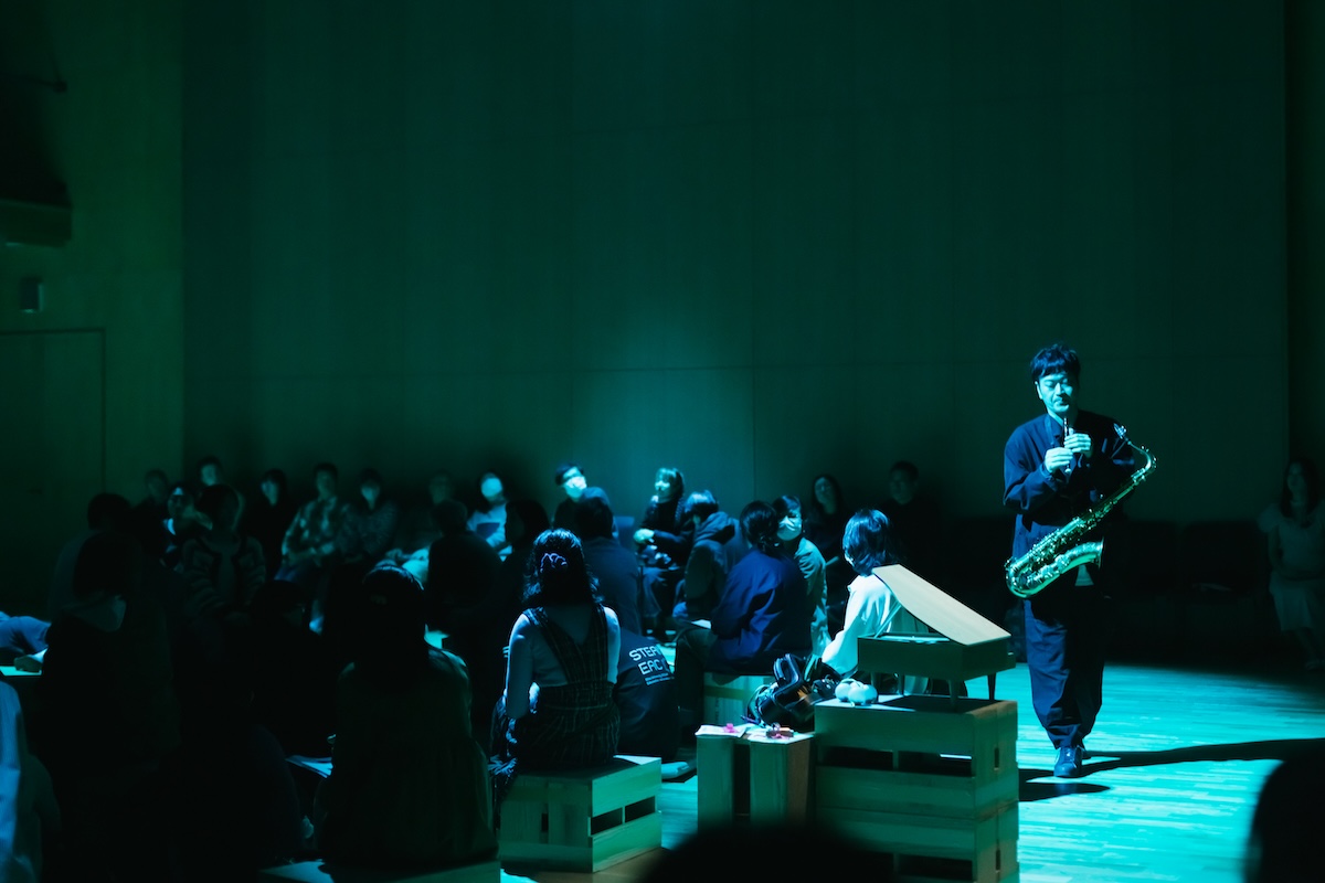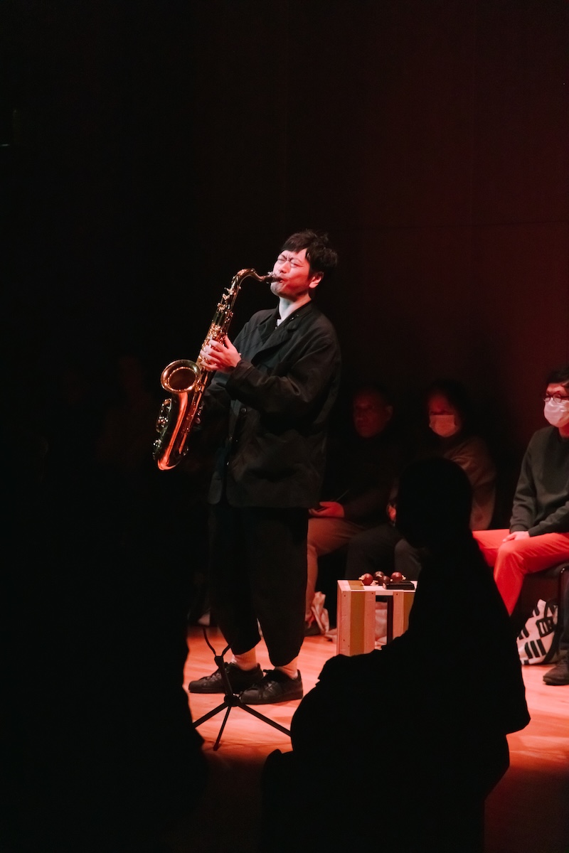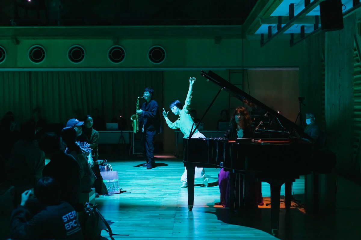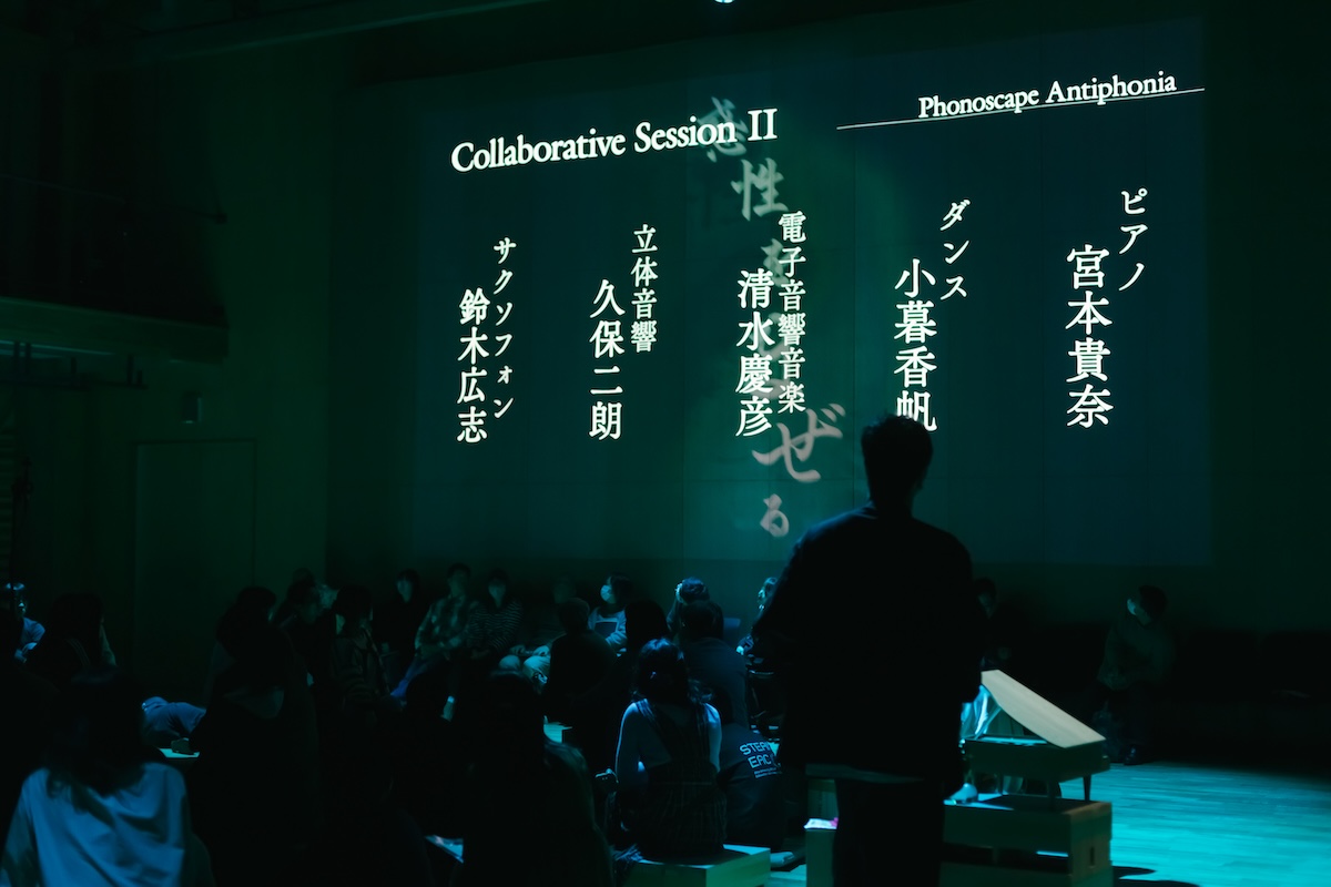 Collaboration Ⅱでは、「清水慶彦(電子音響音楽) ✕ 久保二朗(立体音響) ✕ 鈴木広志(サクソフォン) ✕ 宮本貴奈(ピアノ)✕ 小暮香帆(ダンス)」による新作『Phonoscape Antiphonia』の共創が、即興で繰り広げられ、参加者のみなさまの存在とともに、幻想的で刺激的で新しい世界観が、キナーレの空間に出現しました。